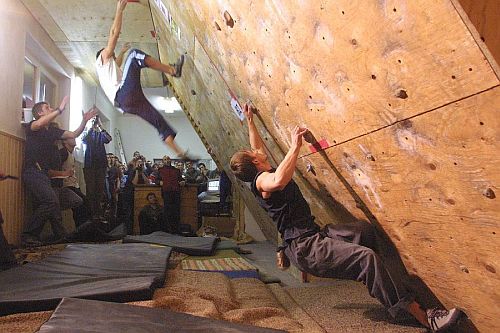 Podle ohlasu to vypadá, že Třinci se i bez věže podařilo zvednout laťku. Hektický závod se neobešel bez drobných chyb, ale mega kolotoč osmnácti bouldrů se naštěstí nezadrhl. Na pódiu se lezly bouldry na živo, vedle na bílé zdi se promítal přenos z posilovny. O přestávce při přestavování běžela videa a večer nás Pepe přenesl do Afriky, naštěstí jen v obrazech, zatímco teplota zůstávala na příjemných osmnácti stupních. Překvapení bylo mnoho. O závod se zajímali nejen Maďaři, ale i Francouzi. Když jsem jim odepsal, kolik je první cena, tak vážnými zájemci zůstali jen Maďaři..a Poláci. Ti jsou každým rokem v Třinci spokojeni. Stejně jsem nevěřil, dokud se maďarština neozvala ve dveřích. Přijel i sám Csába Komondi a z Polska juniorský mistr světa z roku 2001 Marcin Wszcolek (na podzim se objevil také v Brně). Posledně jmenovaný však v Třinci nezanechal příznivý dojem, ale po pořádku.