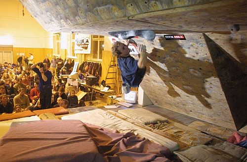 A konečně finále. Přestavovaly se tratě. Na zdi běželo video – bouldering v přírodě, Chris Sharma realizující Realization atd. Třinečtí kluci mě překvapili, když zajistili techniku za sto tisíc.  Neměl jsem na takové shánění už ani čas, ani energii. Největší práci mi totiž nakonec ani tak nedalo získávat od sponzorů ceny či peníze, ale reklamní panely! Ty firmy většinou ani neví, kde jejich reklamy končí, kdo je má. Kdybych se na to vykašlal a řekl si, „jejich problém“, tak příští rok nedostanu nic nebo polovinu a bude to zase můj problém. Tak to byla jen vsuvka, aby nějaký děj zaměstnal vaši pozornost během přestavby těch tratí..