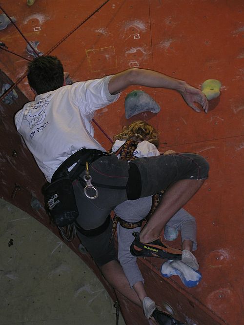 Chvíle před pádem: lezení se zátěží, dostal jsem pak radu, že musím víc poslilovat. Předchozí trénink lezení se zátěží - (se 4letou 20kg těžkou dcerkou Bětkou) na double mé kategorie veteránů nestačil (Gábor Táborosi a já)