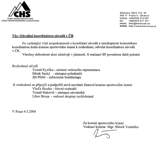 Tato pozvánka byla jím, jak jsem psal výše, dnes zrušena s odůvodněním, že podle sdělení Slávka Vomáčky se komise sportovního lezení dohodla, že Vlasta Volák nebude pořádat SP a že Vomáčko předloží na VV konkurenční návrh. Zeptal jsem se jestli to rozhodla komise, protože zápis ze zasedání nové komise je již na www.horosvaz.cz a tam o tom není ani slovo.  Prý to bylo součástí již korespondence se členy komise, kteří jsou zmínění v mém odvolání. Nedalo mi to, a zavolal jsem Tomáši Rakovičovi a Liborovi Hrozovi, kteří tam jsou podepsáni (Viz obrázek). Dozvěděl jsem se, že Tomáš si není vědom, že by se někdy vyjadřoval k tomu, že Vlasta Volák bude či nebude pořádat SP.  ( S Tomášem již delší dobu domlouváme stavbu stěny na SP, výšku, tvar, peníze atd.). Druhý oslovený jednoznačně prohlásil, že se k pořádání SP v souvislosti se mnou nikdy nevyjadřoval a navíc, že nikdy neprohlásil, že by Vlasta Volák měl být odvolán z pozice koordinátora závodů. Obou jsem se zeptal, jestli toto mohu zveřejnit a oni souhlasili. Podle mne, toto je jednoznačně v rozporu s tím, co je napsáno v mém odvolání a zpochybňuje to roli komise v souvislosti s vyloučením mé osoby (SUMMIT DRIVE) při pořádání SP.