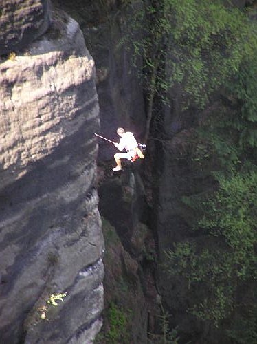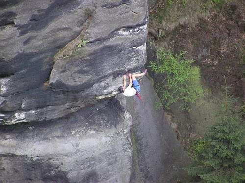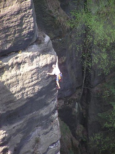 Jo, Arnold to prostě v rajbasech umí, a nejenom v nich. Jednou jsem ho viděl dělat cestu ve Schrammsteinech, tuším Sonnennwendkante IXc. Po přelezení těžké stěnky od (posledního) kruhu se cca 4m nad kruhem na začátku rajbasu zastavil, otočil se na jističe a chvíli  s ním rozprávěl jak se to leze, a to skoro čelem do údolí. Pak udělal pár kroků přes další stupeň, to všechno bez smyčky, a v polici už takových 8 až 10m nad kruhem začal něco montovat. Škoda, že mi pak došel film.