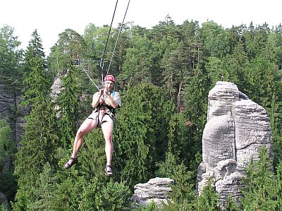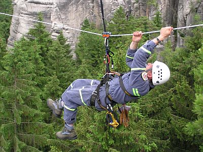 A nakonec trochu adrenalinu. V sobotu po celý den probíhalo v Prachovských skalách největší skalní přemostění, jaké se kdy v rámci pískovcových oblastí Českého ráje uskutečnilo. Dvě souběžná 137m dlouhá lana byla natažena mezi vyhlídkami Všetečkovou a Českého ráje a více než 120 odvážlivců si vyzkoušelo jízdu po laně ve výšce několik desítek metrů nad údolím, aby tak spatřili prachovské dominanty ze zcela jiného pohledu než jsou zvyklí.
