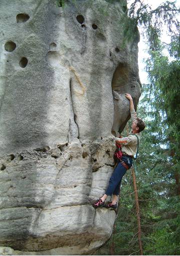 e)  Rokáček  VI  Martin Stránský, Jaroslav Herman, 8.8.2004. Údolní JZ převislou hranou šikmo doleva k hodinám, do okna (jištění) a vlevo šikmo stěnou na vrchol.