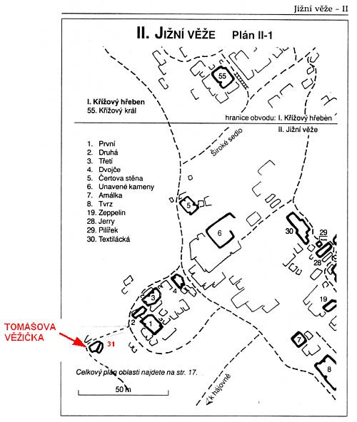 Pro zájemce prikládám nástupový nákres cest s popisem a polohu Tomášovy věžičky. Kdo vlastní nového pruvodce z roku 2001 na Křížák, tak je to z mapky na str. 91-jižní věže.