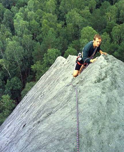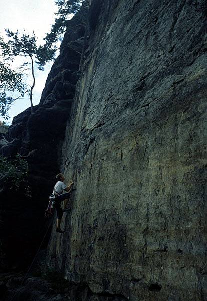 Při obchůzce kolem Falku asi každého zaujme západní hrana neboli Westkante VIIIa a její přímější varianta Direkte Westkante VIIIb. Dvacet pět metrů k prvnímu kruhu, pak krasný kout přes další dva kruhy a zde se odděluje Direkte přes čtvrtý kruh. Ke třetímu kruhu je to originál Westkanta z roku 1920 a tak je trochu uklidňující, že v té době snad borci nelezli nic, co bychom dnes my sváteční lezci nepřelezli. Od třetího začíná Direkte z roku 1956 a to už se asi jinak lezlo. Byl tam ale čtvrtý kruh a tak jsem si říkal, že to nejtěžší bude určitě kolem něj. Ó, jak jsem se mýlil. Každopádně tato cesta byl pro mě mýtus, který ve mně dva roky zrál. Při každé další návštěvě Falku jsem si vsugerovával, že to přece musí jít a teď nastal ten den D. Ani jsem nemohl dospat. Trému jsem měl jak před porodem (samozřejmě mé ženy). Výhodou lezení na písku alespoň pro mě je, že permanentně hubnu. Člověk má permanentně strachy sevřený žaludek, takže skoro nejí, na druhou stranu ale strachy permanentně vylučuje. Mě se to někdy ráno stane i třikrát: když vstanu, než si navléknu sedák a až si ho navléknu. Tohle byl sedmý den, poslední den, byl jsem štíhlý a perfektně rozlezený. Nemohl už být lepší den pro přelezení Direkte Westkanty.