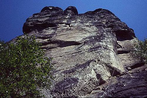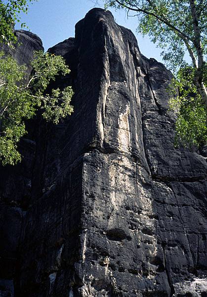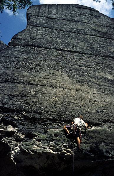 A je tady další lezecký den. K rozlezení jsme zvolili cestu Wurzelblick VIIc na věž Lehnkuppel. Pěkná cesta. Nejdřív krásný sokolík a pak rajbásek přes dva kroužky. A pak už jsme si měli přivonět k největší krásce, kterou tato oblast skrývá, a to k Lole (Lolaturm). Tato věž je jako krásná žena, člověk je schopen se do ní zamilovat na první pohled. Ale jak už to v životě chodí: ona je krásná a štíhlá, já jsem naopak škaredý a tlustý a tak jsem si na ni netroufl. A přitom ona by možná chtěla. A tak jsme si řekli, že to tentokrát zkusíme. Nejdříve to na ni Čelda zkusil jemně z boku a tak dlouho se třel po její Lolakantě VIIIa, až dosáhl vrcholu. Cesta má na padesát metrů tři kruhy a zvlášť oblézt druhý a třetí není vůbec zadarmo. Krásná cesta. Všichni ale ví, že Lola je nejkrásnější od jihozápadu, kde v roce 1966 vytýčil cestu Sudwestwand VIIIa (VIIIb) Bernd Arnold. A tuto cestu jsem si rezervoval já. Nejdříve zářezem u pravé hrany do úrovně prvního kruhu a založit smici. Pak traverz ke kruhu. Cvaknout ho, udělat těžší krok a pak už stačí jen brát a brát čím dál tím větší kyzy přes další dva kruhy, až člověka v té extázi ani nenapadne, že by se měl stejně jako v životě, když má styk s kráskou, chránit, v tomto případě spíše jistit. Tahle cesta je prostě sen, který jsem si po dvou letech splnil.