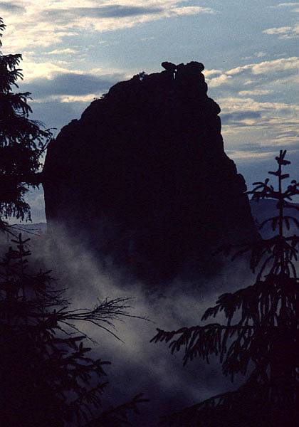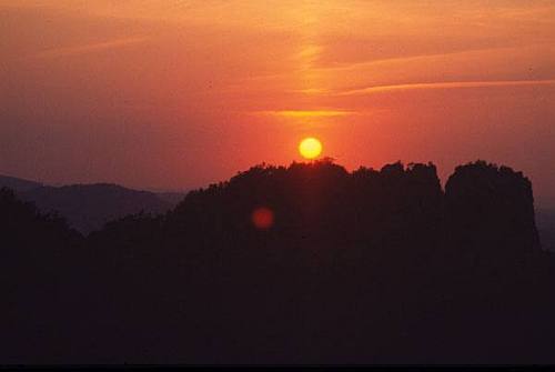 Tak a kam dál. Podle průvodce se asi nejvíce leze u městečka Hohnstein nebo na druhé straně Brandu u Brandhotelu. Na obě strany je to z místa, kde jsme, kus cesty, od hotelu je to ale blíže k autu, takže jsme zamířili tam a to na věž Brandscheibe, která vypadá z dálky moc pěkně. Ani zblízka to není špatné, zvlášť jihozápadní hrana, po které vede cesta Traumkante VIIc (VIIIa). Na závěr si Čelda v průvodci vybral věž Hafersackkrone a cestu Olympiawand VIIIa (VIIIb). A musím říct, že vybral dobře, protože až ke třetímu kruhu se jevila skvěle a kdyby nezačal liják, určitě by to bylo skvělé i kolem posledního čtvrtého kruhu. Takže příště.