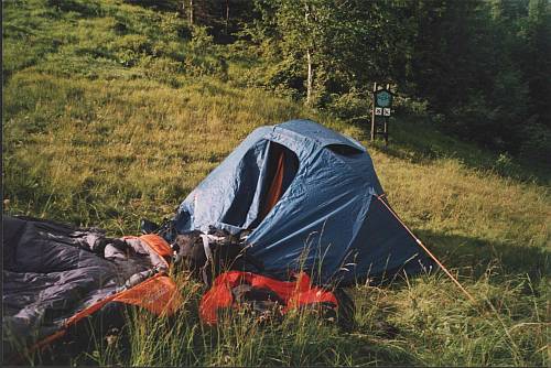 Vyrážíme. Cesta nejprve kopíruje lyžařské sjezdovky a posléze zachází do lesa. Jdeme sami. Nikde ani živáčka a tak si to tichu hezky užíváme. Přecházíme kamenné moře a po odbočce se dostáváme na větší louky. Je to nádhera. Zase na chvíli dýchat čistý vzduch. Za pár minut přicházíme na louky pod vrcholem Kečka... Ha lidi. Jsou tři. Všichni upocení jak vrata od chlíva, válí se po zemi a tlačí řízky! Pěkně pozdravíme, prohodíme pár slov, ale raději jdeme dál. Cesta vrchol Kečka sice traverzuje, ale my jako správní horalové stoupáme na horu na horu. Odtud je hezký výhled do sedla Hadlanka a strmý stoupák na Kozí chrbát. Však za pár minut nám Chrbát prověřuje chrbát a hlavně nohy. Slunko svítí, ptáčci si prozpěvujů a mravenečci jak sa pilně procházajů.....dáváme si oraz. Stejně máme na triku mokré každé vlákno a navíc máme pekelnou žízeň! Během několika sekund v nás mizí tabulka čokolády. No ona je spíše v tekutém stavu. Z Kozího chrbátu cesta klesá do Hiadelského sedla a to jak strmě nahoru tak strměji dolů. Navíc v lese je pěkné bláto, tak si pochvalujeme hůlky. Přicházíme do sedla, kde u ohniště stojí stan. K našemu udivení zjišťujeme, že to jsou oni tři turisté, co jsme je potkali na loukách pod Kečkou. Tak jako tam Kečku, tak Kozí chrbát traverzovali. Když k tomu ještě připočteme náš piknik, tak se není čemu divit, že už se zase válejí.