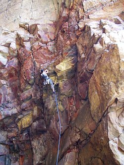 Jedny ze sektorů, která nás uchvátily a přiměly k vybalení lana se nazývají Recital Hall a Music Hall s dlouhými dobře zajištěnými cestami, kde není tolik důležitá síla v prstech, ale spíše schopnost udělat sem a tam dlouhý krok a občas udržet nějaký ten oblan. Trochu bych to přirovnal k Rovišti. Občas lze někde zaklínit patičku nebo kolínko a vyklepat.