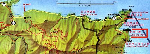 Pojedete po dálnici č.1. vedoucí ze severu do Keelungu. Brzy po té, co podjedete dálnici č.3 a projedete placením a pojedete dalších asi šest kilometrů. Vyjedete na exitu označeném North East Coast (severovýchodní pobřeží). Tímto směrem jedete asi 14 km, až najedete na dálnici č.2.