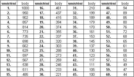 Každému umístění v jednotlivém závodu je přiřazena bodová hodnota. Závodník/ce s největším počtem vyhrává. Speciální bonifikaci 200 bodů získá každý závodník/ce, který/á se zúčastní všech závodů.