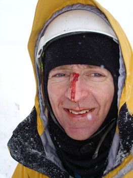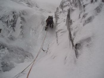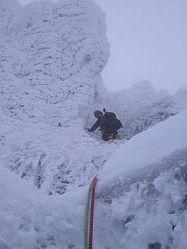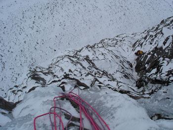 Na druhého dolézám první délku, na štandu si udělám pořádek v matroši, prohlédnu spáru a raději hned jdu. Nechci ztrácet čas uvažováním, stejně nic nejde vidět. Obtíže začínají už od startu-jsou tu móóóc špatné nohy, takové zrádné oblinky, vůbec jím nevěřím. A tak musím fixovat a shybovat, nohy jen tak náhodně stojí a pořád ujíždějí. Navíc při čištění mi padá sníh do obličeje, očí, za krk… Vidím jen, jak se chudák jistič choulí do klubíčka před sněhem. S jištěním to není žádná sláva, spára je oblá, nic tam nedrží. Co založím, je špatné. Říkám si, že by mě to neudrželo. Tak tomu tady říkají VII… Jdu bezhlavě dál, metr po metru, předloktí začíná natékat, je třeba sklepávat… Nejspíš to bude ta druhá číslice 7…