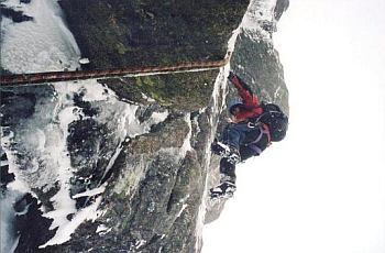 Naštěstí víš se stěna mírně pokládá, stupy jsou jistější. Jsem zachráněn, dávám dobrého vklíněnce, už můžu klidně padat, do štandu to určitě nebude. Legrace taky byla při závěrečném traverzu, kdy spára brala na spoďák. To jsem jednoduše hodil cepíny přes ramena (jediná výhoda lezení bez poutek) a jako na bouldrovce zabral na max. Vzpomněl jsem si přitom na velké spoďáky ve višnovském Maratonu, ale do smíchu mi tady dvakrát nebylo.