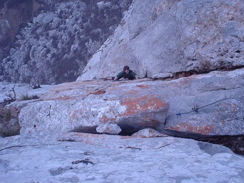Start byl veselý a jako důkaz pohody někteří jedinci zpívali punk. Lezli jsme celkem čtyři lezci a dvě lana. Čekali jsme se vždy na štandech a střídali se po délce na prvím.Byla to krásná, lehká a skvěle odjištěná cesta, kde se střídalo jak lezení ve stěně tak lezení v hlubokých spárách. Orlí signály (jistím,lezu,dober) a zpěv Vaška tomu lezení dodávaly ještě kouzelnější atmosféru. Asi v šesté délce se nám ukázalo na chvíli slunce a pod ním zářící moře. Byl jsem v polovině šesté délky, kruh čtyři metry pode mnou  a nade mnou ale i přesto jsem  na chvíli přestal lézt, potit se a řvát jisti vole, a na chvíli jsem tam jen tak visel, pozoroval tu krásu kolem a dýchal slaný vzduch proudící od moře. Vzdálenosti od jednoho štandu k druhému byli tak daleko, že když jsem křičel mám štand tak můj jistič pevně držel lano s domněnkou, že slyšel padám vole! Kouknu nahoru a asi dvě délky nad námi další lezecká dvojice. Tak si to tak pěkně šlapou v nejtěžší délce skály když v tom najednou plesk a borec letí, letí a letí. Škub a visí v laně. Fakt pěkná držka, až mi šel mráz po zádech. Další minuty jsem musel trochu rozdýchat protože můj morál spadnul dolů s ním. Raz, dva, tři a vzhůru.
