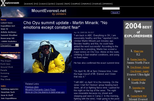 http://www.mounteverest.net/story/ChoOyusummitupdate-MartinMinarikNoemotionsexceptconstantfearApr182005.shtml