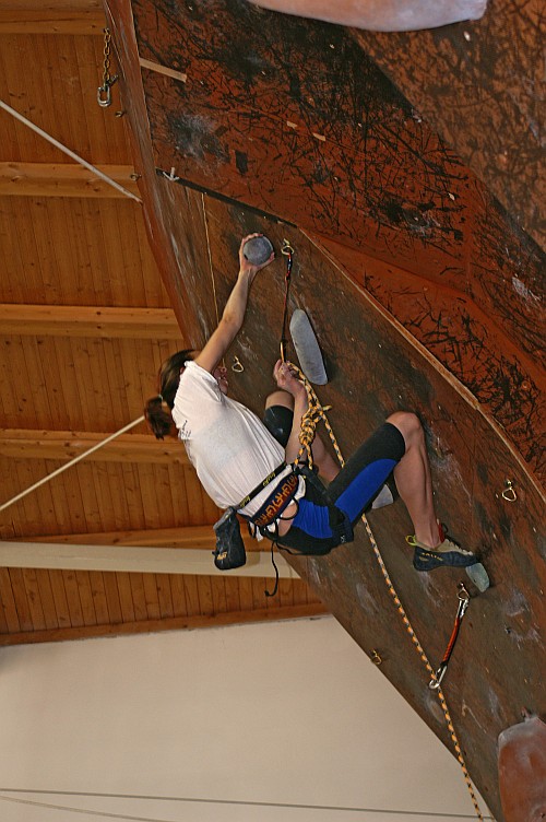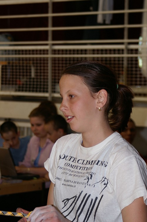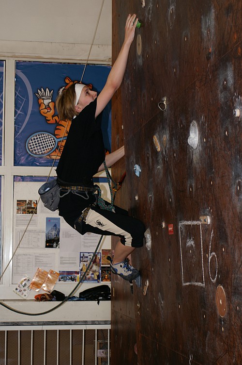 Po dostavění poslední finálové cesty přichází nejprve na obhlídku děvčata kategorií C a D. Jelikož se lezlo na cestě společné i pro nejstarší kluky, tak nám holky padaly v začátku cesty. Přesto musíme pochválit výkon Zuzky Zbrankové, která podala v souboji s Míšou Pospíšilovou a skončila v hraně převisu.