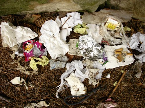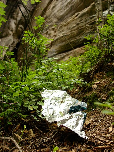 Přišli jsme k čertově věži, blízko Mnicha, poblíž vede značená cesta pro turisty, kde chodí jeden za druhým, občas někdo odbočí, aby se podível k věžím. Vzhled toho místa nebyl daleko od zájkladu skládky komunálního odpadu!! Hromádka odpadků na fotce, čítající několik vajglů, obyly od tyčinek, toaletní papír a jinou verbež, byl v okolí čertovi věže rozmístěn natolik strategicky, že se opravdu nedalo podívat kamkoliv, abych neviděl nějaký odpadek. To už mě jímala hrůza. Mít u sebe nějakou zbraň, tak zastřelim každýho turistu co tam okolo šel, bez ohledu na jeho ekologické chování. Pak jsem ale zezřek dva lezce, jak se před cestou posilnůjí nikotinem, a hned jak dokouřili, vajgl se samozřejmostí zahrabali do písku. Rázem se mi  vzteky zatmělo před očima, to byla fakt podpásovka. Pustil jsem se do nich, že jsou to prasata a ať to odnesou do do koše, kterej byl necelých třicet metrů vzdálený! Ten dobytek (nedokážu to napsat jinak) se mi místo toho jal vysvětlovat, že je to jenom papírek a že se to rozloží. Kdybych se hůř vyspal, tak tam asi jak tam tak sedí na něj skočim a jednu mu natáhnu! A teď se dostáváme k základu problému, on se ten toaleťák, ubrousek či vajgl doopravdy do roka rozloží. Ale kdo se na to má ten rok koukat!!!! Tak nebuďte prasata a svůj odpad si odnášejte, ať se za vás nemusím stydět.
