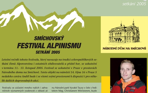 Letošní ročník tohoto festivalu, který navazuje na tradici celorepublikových setkání členů Alpenvereinu i ostatních obdivovatelů a přátel hor, se uskuteční v termínu 11. - 13. listopadu 2005. Festival se uskuteční v Praze v prostorách Národního domu na Smíchově.Tento objekt na náměstí 14. října 16 v Praze 5 nedaleko centra Anděl bude i se všemi svými prostorami k dispozici i pro několik dalších doprovodných akcí.