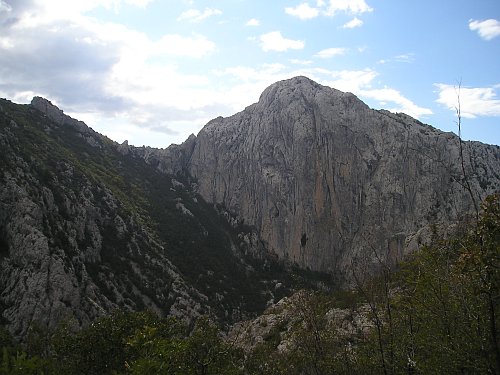 Před touto cestou jsem měl respekt ostatně jako před každou více délkovou cestou a po zážitku z úterka, jsem nechtěl nic nechat náhodě. Vztáváme v 6.30 nula nula a vyrážíme do skal. Nastupujeme v 7.30 nula nula a dáváme krasných padesát metrů v režimu 5b sokol, spárka, chyt, stup a všude nýty. Velmi příjemné lezení po krásném vápenci, za krásného počasí idilka jak má být. První délku jsem vzal tak nějak šmahem, což Kendy komentoval slovy: " Ty vogo ty si to lezl na prvnim jak já na druhym". "Nechci jít zas domu po tmě no". Opáčil jsem a už jsem ho štimoval na další postup. Štandy se zhustily, takže jsme stavěli každých patnáct dvacet metrů, což se nezdálo být příliš ekonomické, vzhledem k šedesáti metrům našeho dvojtého lana. Proklestili jsme se částí traverzů a dostali jsme se pod 6a+. Kendy ho s menším zaváháním přeběhl a já ho dal po něm na druhym. Pak jsem spojil délku 5a a 3a. Kendy si dal 4a a jistil mě s pokyny: "dělej nestíháš", trochu si osvěžil tempo Prachovské 24hodinovky a hnal mně jak psa  . Poslední dvě 4a a 4b jsem také spojil a na vrcholu stanul 12:37, takže celkem spokojenost. Kydž jsem Kendyho začal dobírat byl už pode mnou, takže jsme na vrcholu byli oba během chvilky. Byla to nádhera rozhled na moře, svěží vánek, sluníčko, za námi hory Velebitu v mracích.