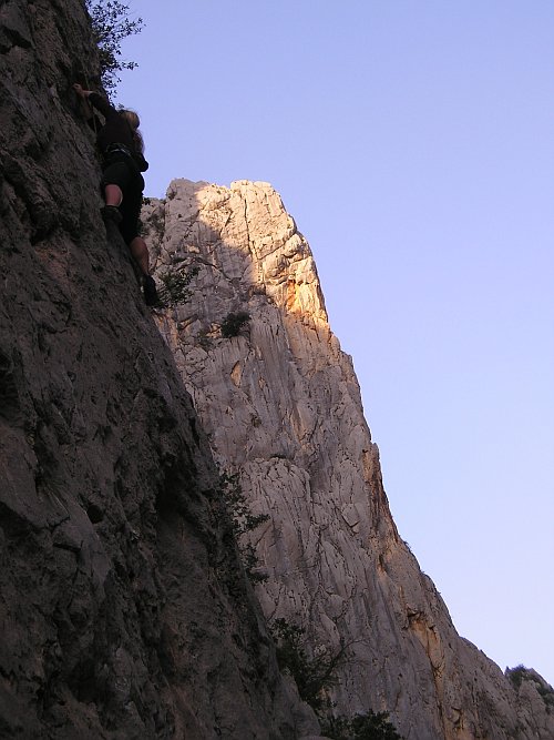 Začlo se připozdívat, byly čtyři hodiny a tři délky před námi. Slunce zapadalo okolo 18.30, takže jsme měli co dělat. Navíc mistní vítr Bura sílil a s ubyvajícími silami nám začalo být dost chladno. Nabídl jsem Daně svou nepromokavou bundu a šel se zahřát do dalšího 6a. Celkem lehčí lezení až na jedno místo, kde jsem se nepříjemně trápil v otevřeném komínku celkem dost mi vadil batůžek, nejdříve jsem ho chtěl zanechat v nýtu, ale po té jsem své rozhodnutí přehodnotil a vrátil jsem se pro něj a komínek oblezel po pilířku, což se nakonec zdálo snažší, více převislé, ale ne tak náročné, jak dření kolen v komíně.(Komínů jsem na písku nalezl dost, ale tenhle byl nepěknej ;) ) Další štand a už jen dvě délky 5a před námi, když Dana dolezla 6a slunce se začlo nebespečně chýlit k západu. Pokračovala na prvním, ale asi po deseti metrech s jedním friendem ji došel morál a v těžkém místě se začla vracet, když v tom místě strávila asi patnáct minut, přesvědčil jsem ji ať se na to vyprdne, přece jen pád do jediného frienda deset metrů nad štandem, není pro oba lezce nic příjemného, navíc dvě délky pod vrškem, nebo chcete-li osum délek nad zemí bez možnosti slanění. Vrátila se ke mě na štand a situace začla být poněkud nepříjemná. Slunce nám zapadlo a tma se šířila velmi rychle. Dana naštěstí nepodcenila situaci a měla s sebou čelovku, kterou mi půjčila a já se vydal vzhůru k štandu číslo devět. Chudák moje kolegině, musela dolézat za svitu měsíce a hvězd předposlední délku a to jsme měli ještě jednu před sebou. Na štandu číslo devět na nás od spoda začli blikant naši drazí Honza a Aneta a marně se pokoušeli zjistit naši situaci vysláním morseovi zpravy, na tu jsme jim odpověděli smskou, že je vše v pořádku, jen že poněkud nestíháme. Bylo nám dost chladno a prsty už říkaly dost. Vyrazil jsem sokolem v obtížnosti 5a za svitu čelovky a snažil jsem se lézt opravdu rychle. Dostal jsem se pár metrů pod vrchol, kde se sokol nepříjemně vzdul ve velký převis a navíc nikde nýty, znejistěl jsem, koukám okolo a tam pode mnou vlevo ubíhají nýty a třpití se v záři čelního světla, tak zas  rázuju dolů tím krásně beroucím sokolem, traverzuji a mírně slezám k liniji nýtů a pak již vesele na vrchol. Dobírám Danu a užívám si ten krasný pocit na vršku, snažím se ji svítit dolů, ale příliš to nejde. Z vrcholu ujišťujeme kolegy v táboře, že je vše OK a jdeme přes vršek Anči směr kemp. Na Anče jsme ještě potkali stádo koz a ovcí, kterým přízračně svítila očka a obzvláště kozlové a berani vypadali za svitu měsíce dost hrozivě. Naštestí byli plaší a dali se na úprk. Cestou dolů nám svítil měsíc a bylo nám krásně. Těsně po půlnoci jsme dorazili do tábora.