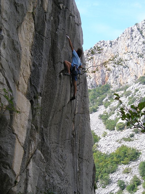 Rozlézám se a uspokojuji Anetiny potřeby na Zavě 4b, dále Vuga 4c, pak si dávám Humping Jacka 6b.Opravdu krasné lezení po lištách, spoďácích a bočácích. Dál pro Anetu Nasti put 4c. Pokračuje moje trápení: Karenin 6c+ pytel. Těžká plotna na začátku a pak nádherné kroky v převisu, bohužel jsem to nedal v kuse, vedle nová cesta na Karenin tak 5a. Dále lezeme na Zavě Čuja ti si bog i batina 5a a bezejmenou 5a, pak slézám Pod Iljuskom vedoucí převislou hranu "Je" 6c , dále Biene Maju 6a+, Fleissige Villi 6a, Figa 4b, Mann oder Memme 4b+ a nakonec krásnou převislou cestu Inox za 6a+.