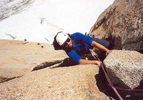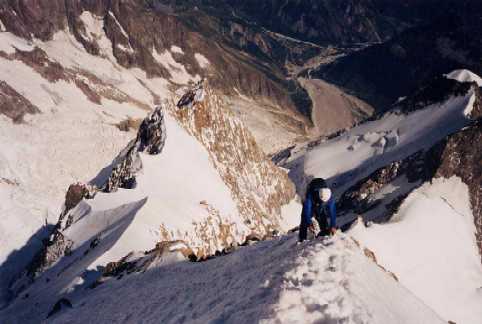 Ale naše neklidný duše začali opět toužit po těch bílejch horách. A tak žhavil Péťa, žhavil drát, až se dovolal na meteo a pak už to má rychlej spád, dokaď do Cham nedojedem nejdem spát. Ráno si v domě horských vůdců ujasňujeme jaký máme možnosti. Chceme jít něco delšího, moc dobře víme co, ale v horních partiích je na policích sníh a tak bychom museli slanit z poloviny výstupu, tak jak to dělá hodně družstev, ale jak to nechceme udělat my. Přece jen cesta vede na vrchol a já ani Petr to nemíníme ošulit. Krom toho je vcelku málo času. Dnes je hezky, no ale dnes už můžeme počítat jen odpoledne, zítra má být taky hezky a pozítří odpoledne už se to má zkazit. Chce to něco co budeme moc lízt rychle a nejpozději pozítří budeme sestupovat. Rozhodujeme se rychle, klasický alpinismus, hřeben Peuterey s nástupem přes Col Moore. Jdeme hezky na lehko, jedna půlka lano, pět karabin, smyčky, čtyři vklíněnce, dvě skoby, vařič, ešák, dvoje rukavice. Večer v bivakovací budce Furche zjišťuju, že nemám ani podvlíkačky. Doufám že zejtra nebudem nikde bivakovat. Máme sice jeden žďárák, ale bez podvlíkaček nevím, nevím. Vyškubávám zpod jednoho Itala deku a jdu si do jedný hrát na spánek. Ve dvě vyrážíme. Slejzáme, pak hup přes okrajovku, napříč ledovcem a vzhůru do sedla Moore. Tady jsem v devadesátým osmým s Hlaváčem nastupoval ostruhu Brenvy. Začínáme slejzat ze sedla na druhou stranu na ledovec pod Grand Pilier ďAngle. Ale sestup je snad tou nejčernější můrou. Jsou tu jen volné bloky, mezi nima šotolina, všechno to ujíždí pod nohama. Petr hledá cestu a jsem mu za to vděčnej, protože mě se to teda vůbec nelíbí. Dole se konečně dostáváme na sníh, ale okrajovka je příliš vysoká. Petr nachází smyčku seknutou mezi dva bloky, ale moc se mu to nepozdává. Holt šumavák. Mrknu na to svým pískařským vokem a \"to je tutáč, jedem dolů\". Když stahuji lano, zaduní nad námi stěna Brenvy. Krve by se v nás nedořezal, dolů to kalí lavina a my dole čekáme jak to dopadne. Zas máme kliku, lavina se zastavuje daleko od nás, k nám se dostává jen takovej ten smrad do sebe narážejících kamenů. A teď už vzhůru. Prokličkujeme mezi trhlinami a podél obrovské žulové plochy východní stěny Grand Pilier ďAngle to ledovou plání valíme nahoru. Sluníčko za Matterhornem roztápí nový den a mi v 7 hodin dolézáme do sedla Peuterey. Tam dva angláni právě vstávaj, celou noc seděli jen tak na lanech. Jdou do pilíře Freney, ten jeden má na sobě tepláky s lampasem, asi docela drsňáci. Upřímně si popřejem hodně zdaru, v horách se to tak ještě občas dělá, a jdem si každej po svejch. Když stojíme pod jižní stěnou Grand Pilier ďAngle je nám cesta vzhůru úplně jasná. Támhle tím žlábkem, pak támhle uhnem k tý věžičce a je to. Ve stěně už to tak jasný není, všechny žlábky nám přijdou stejný a tak se tam tak motáme, postupně na nás na oba přichází krize, máme toho dost. V poledne jsme konečně u \"tý\" věžičky a vyhlašujeme polední pauzu. Vařič ven a už to jede. Chlemstám vodu jako Škerda pivo. V jednu nastupujem na závěrečnej úsek, nádhernej sněholedovej hřeben kterej vede až na Mont Blanc du Courmayer a pak dál na Mont Blanc. Únava se hlásí o slovo a tak když po 17 hodinách lezení dorážíme na Mont Blanc, docela se nám ulevilo, že už jsme nahoře. Jsem tu potřetí, pokaždý jinou cestou a znovu je to krásný pocit. Toho výhledu se nikdy nenabažím. Sestupujeme. Valotka je narvaná lidma, co chtějí zítra \"dobýt\" vrchol. Ani jeden nemáme náladu se tady s nima mačkat. Valíme na Grand Mulet, dál nejdem, máme toho dost. Ráno pak dolů do Cham, skelety dolů, nažrat, napít, opít, spát a pak domů, stejně už zase leje. Co dodat? Nic, to se musí prožít.