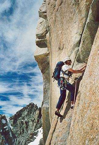 Ráno je obloha bez mráčků, mrzne a sluníčko nalejvá optimismus do našich prochladlejch dušiček. Slunce holt ví jak na nás, jak z nás zase udělat ty správný alpinisty s touhou po lezení. Tak teda dneska jdem na toho Rebuffata. Cesta je to nádherná, spáry, plotny, sokolíky, dobře odjistitelné, žádný volný šutry jen pevný oranžový granit. Úvodní délky mám zmrzlý hnáty, ale pak už si začínám lezení vychutnávat. Až na ten batoh se skeletama, mačkama a cepínem na sestup je to fantastický výstup, přesně to, na co jsem se tak těšil. Cesta je vcelku jasná, akorát že ji křižuje několik jinejch cest a variant. No a to bychom ani nebyli my, kdybychom před poslední délkou do nějaký takový varianty neuhli. Přišlo mě to sice na čtyřkovou dýlku dost těžký, ale říkám si \"seš měkej Pájo, jen zaber\". Jenže pak už nám to dál nejde ač se snažíme nasadit takový fígle jako třeba stavění. Konečně nám dochází, že jsme asi mimo, takže harakiri slaňování a tak podobně. Nakonec, když ve stanu klohníme v ešáku večeři, máme pocit nádherně prožitýho dne a těšíme se na další. Možná některý pilíř na Tacul a pak na Kápa alias Grand Capucin a co já vím co ještě. Jóó to se to plánuje když svítí sluníčko a batoh je plnej jídla.