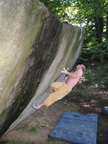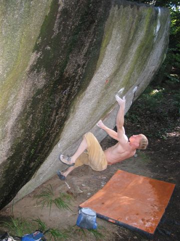 Sumarizace každého roku se však chtě nechtě vždy dostane k hodnocení těch číselně největší výkonů. I po roce 2005 zůstává ve výčtu petrohradských top boulderů osamocené 8B, Frodo Nakole na Nočníku. Navíc bez opakování. Snad se ho dočká se zvyšující se frekvencí návštěv zahraničních siláků. Pevně věřím, že se dalšího boulderu v tomto stupni brzy dočkáme od Rosti Štefánka, který zkouší krásnou linku v pětačtyřicítce na Vyhlídkové. U Rosti na chviličku zůstanu, neboť je autorem jediného čistého 8A+ v tomto roce (vyjma věcí na příští PADání). Koncem října jsme měli možnost sledovat koncert síly a techniky v neuvěřitelně hladké stěně kamenu Japonsko na Bráně. Vznikl tak boulder Nanuko, který traverzuje kámen zleva doprava. V minulém roce zanechal Rosťa na Petrohradu ještě kreaci „Starý muž“ na Rosťově. Když jsme ten kámen takhle pojmenovávali, věděli jsme, že se sem jednou Rosťa vrátí a něco svého si vyleze. A ono NĚCO je pořádně těžké 8A (možná s malým plusem). Kromě těchto přelezů musím ocenit ještě druhý neméně důležitý význam Rosťova lezení v Petrohradu a tím je díky jeho zkušenostem z venku jeho funkce jakéhosi barometru obtížností těch nejtěžších prásků.