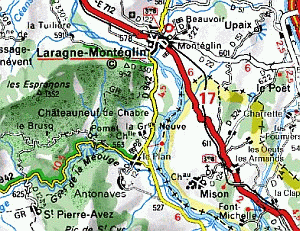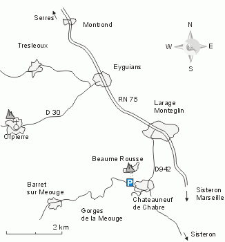 Ze silnice vedoucí ze Serres na Sisteron (RN 75) do  Lagragne Montéglin doprava na Chateauneauf de Chabre (D 942). Z vesnicí asi 1 km je parkoviště po pravé straně. Na parkovišti je informační cedule o skalách a přístupu k nim. Výstup ke stěnám trvá asi tak 10 minut.
