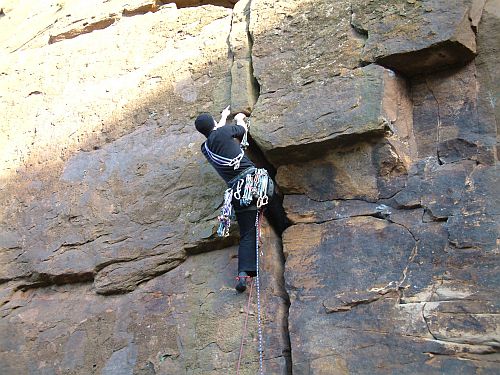 Spára má na prvním 3-4 metrech tu blbou šířku - ani dlaň či pěst, ani rameno. Takže se sápu nahoru pomocí všech třecích ploch, které mi moje tělo poskytuje. Jsem rád, že tu jsou čeští krajané, protože jejich rady na zakládání želez a cvakání toho správného lana se mi dost hodí. Asi metrový převísek - dávám vklíněnce pod něj a ještě jednoho + frienda nad něj. Vytváří to takovou dvou spáru. Zkouším to dál. Mám nechutně nateklo. Dělá mi problém převalit prdel přes hranu - ruce zažábované co to jde, nohu k pupku, stavím se a "do..ele, kur...a." - stojím si na laně. Sedám a vyklepávám . Na další pokus se mi konečně podařilo postavit se nad převísek, ale..... ale ruce už mi hlásí, že to na ně začíná být trochu moc. Natažený jak blb držím polici a snažím se založit frienda. V tuhle chvíli jsem majitelem tak exkluzivních bandasek, ze ho nemůžu zmáčknout.