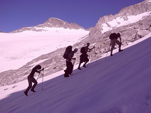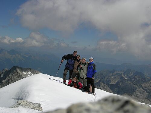 Ranní probuzení nás dostalo! Kromě toho, že jsme jedinkrát za celý týden v tak brzkou hodinu vstávali, nás přivítala vymetená modrá obloha s ranním oparem na obzoru. Rýsoval se slunečný projasněný den bez mráčku, což nám dosti přidalo na náladě a kuráži k velkému výstupu. V malých baťozích jsme si nesli jen to nejnutnější jako jídlo, oblečení, sluneční brýle a podobné vybavení na ledovcový vrchol, mužští střídavě nesli velký batoh převážně s horolezeckou výbavou, která se mohla hodit vzhledem k tomu, že jsme neznali přesně terén Pressanelly. Asi po 500 metrech začala kamenitý povrch nahrazovat zeleň. Ta byla poblíž bivaku již zřejmě několikátý den vypásána široce rozprostřeným stádem pasoucích se černých horských krav. Ty neušly dlouhý úsek cesty naší pozornosti a ani ony nešetřili svou zvědavostí k nám. Vystoupali jsme na kamenitou morénu. Úzká ne příliš stabilní pěšinka na jejím hřebeni se po obou stranách prudce svažovala asi 100 výškových metrů dolů, což byl alespoň pro mě, přestože mě podpírali turistické hůlky, dosti úzkostný úsek cesty. Následovalo balvanovité moře, značky byly nahrazeny mužíky, podle nichž nebyla přesná orientace úplně možná. Připadali jsme si jako kamzíci, ale poté, co jsme je spatřili a pozorovali s jakou obratností se pohybují po velkých různorodých šutrech, jsme si tak připadat přestali. Již z morény jsme poprvé zahlédli ledovec táhnoucí se z vrcholu. Na svém konci rozvrásněný a smíchaný s kamennou sutí neohromoval tolik, jako čistá bílá sněhová vrstva výše.