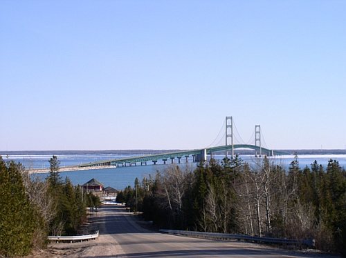 Prvni oblasti, kam jsme spolu se zdejsi ledolezeckou smetankou (zdejsi „lezci“ me prijdou, ze v mnohem vetsi mire lezou na ledech nez na skalach. Asi to je tim, ze mohou ukazat jak maji kompletni vybaveni- cepiny, macky, 20 sroubu od BD ( kazdy za min 50$ a plno dalsich vymozenosti, ktere nasinec ani snad v zivote nevidel natoz kdy potreboval)  bylo Mad moose lodge (www.themadmoose.com) v Montreal river harbor v Kanade. Cesta tam trva z Detroitu cca 6,5 hodin a behem ni musite prejet Mackinaw bridge spojujici dolni polostrov ( kde se nachazi vetsina obyvatelstva Michiganu) s hornim polostrovem.Michgane tvrdi, ze tento most je mnohem delsi a krasnejsi nez znamy Golden bridge ve Frisku. Nemohu soudit protoze jsem tam nebyl, tak posud ten, kdo muze.