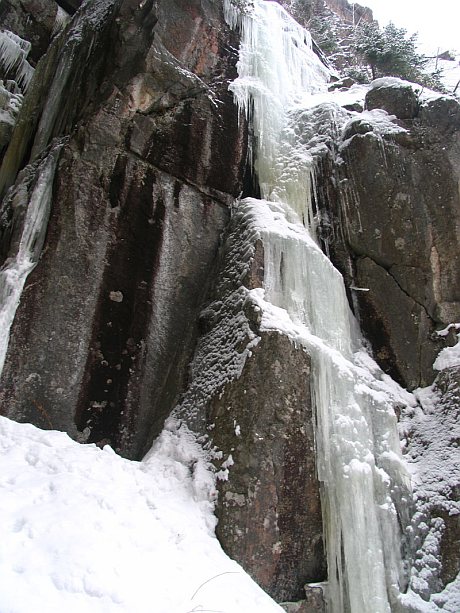 Delka cca 30 metru se srandovnim kolmym dolezem po odtate ledove kruste zvici cca 2 cm tloustky a ta se navic ztencovala a ztencovala az uplne zmizela a ja cumel jen na mokrou skalu bez jedine trhlinky. Jeste ze ten strom na vrsku byl tak blizko....