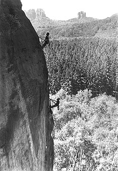 A ještě pár slov k prezentaci. Zapsat si do knížky Berg Heil neznamená totéž, jako být za každou cenu někde zapsaný. Těžko se vysvětluje, co to pro pískaře znamená. Asi totéž, co pro člověka vánoce, objevení světadílu, maturita.Prostě je to součást pískařova života a má z ní docela prostou radost. V Sasku mu ji nikdo nebude mít za zlou. Možná i proto, že se tu pravidla, byť i zastaralá, dodržují. Na druhou stranu je možné, že přichází doba, kdy i veteráni budou muset v zájmu zachování přístupu do skal slevit ze svých zvyků a začít respektovat nové "trendy" v ochraně přírody. Třebas i na svůj úkor. Nikoliv pohodlí, protože o tom se s rukama po lokty ve sněhové čapce mluvit nedá.