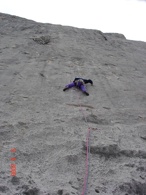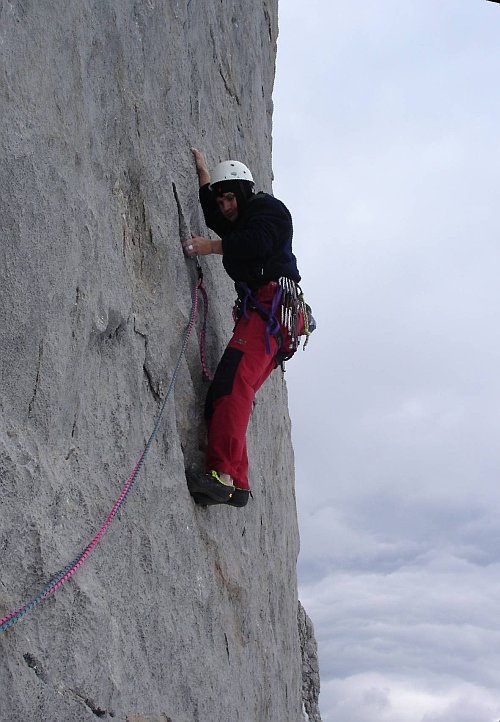 Přes mírně patagonský počasí jsme ještě ten den vylezli jednu z nejhezčích cest v oblasti, Opera Vertical IX- v západní stěně Torsaule. Klasifikace cesty IX- je uváděna v místním průvodci a na bergsteigen.at, ale je to celkem jedno, protože lezení je to parádní. Cesta má celkem 7-8 dýlek docela vyrovnané obtížnosti, začíná převisem, kde to je nejtěžší a potom už to je kolmé lezení v prvotřídním vápenci, v plotnách. Cestu jsme vylezli OS, tj. lezli jsme na střídačku a prvolezec vždy OS, (Kuba nejtěžší délku), díky zimě lehce nad nulou bylo v plotnách alespoň dobré tření. Taky trénink z Panteonu docela pomohl.