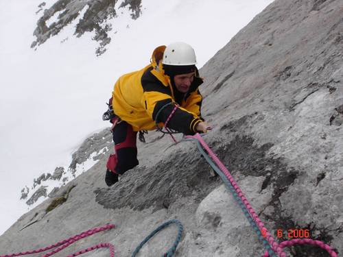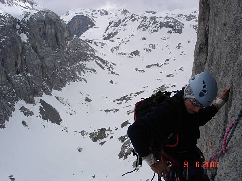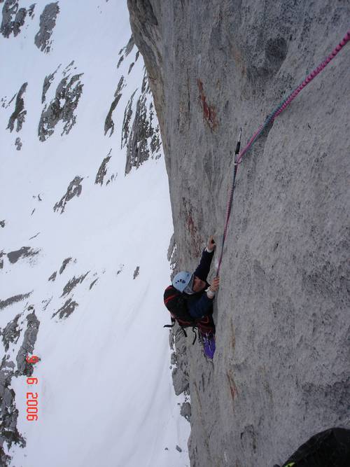 Druhý den byla zima snad ještě větší, takže z původního plánu zkusit vedleší cestu Joly Joker (IX+) sešlo. Kubovi se podařilo dát ještě levou nástupovou variantu Opery (2. délky) Hardrock variant za IX, PP na druhý pokus. Odpoledne začalo sněžit a počasí se definitivně zkazilo, tak jsme sbalili stan a ustoupili do nižších poloh.