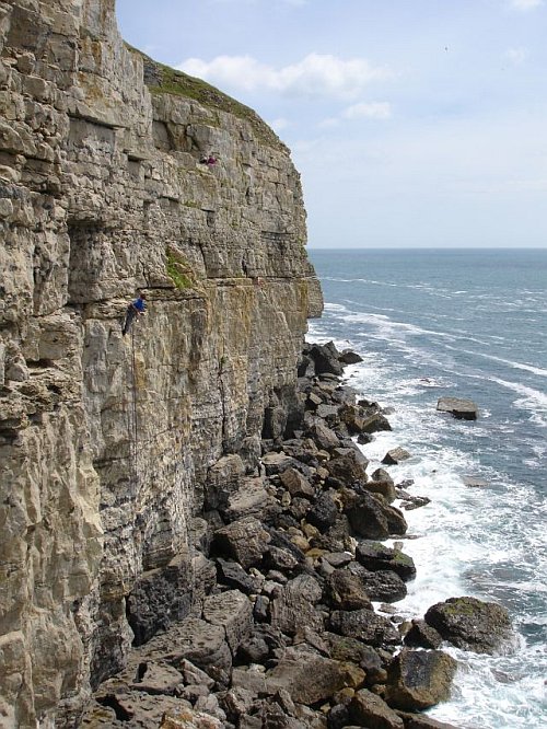 Další den ráno Guy koupil nového průvodce a my se rozhodli zkusit trochu delší lezení po anglicku – ani boltíček, skobička nebo jiné vymoženosti zatlučené do skály. Místo, které jsme si vybrali se jmenuje Guillemot Ledge. Cesty jsou kolem 40 m dlouhé, k nástupu se musí slanit. Počasí se moc nelišilo od toho včerejšího. Tato pochmurnost dodávala tomuto místu nádech Země zemřelých. Pro začátek jsme se rozhýbali na HVSku a pak lezuchtivě slanili zpět k nástupu. Byla řada na Guyovi. Po pár minutách studování průvodce se rozhodl. Cesta se jmenovala Friends from the deep, klasifikace E3 5c. Navázal se, srovnal helmu a jal se velice opatrně vzlínat k výšinám.