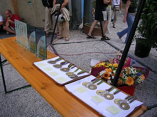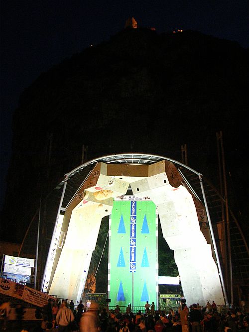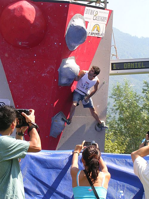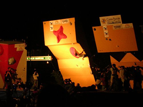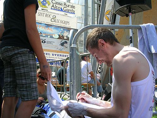 Flavio Crespi, hero italského publika a momentálně jednička světových rankingů v lezení na obtížnost, rozdává autogramy italským dětem v obecenstvu; v žebříčku Světového poháru 2006 je hned za Flaviem jako druhý Tomáš Mrázek