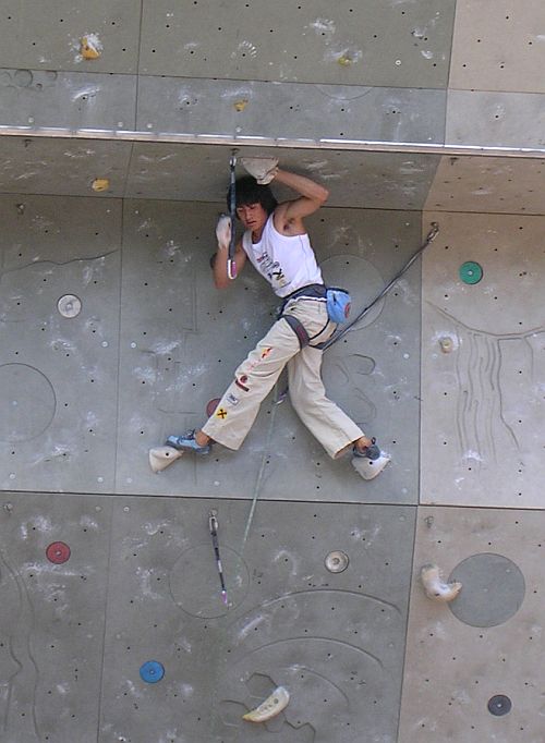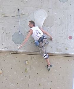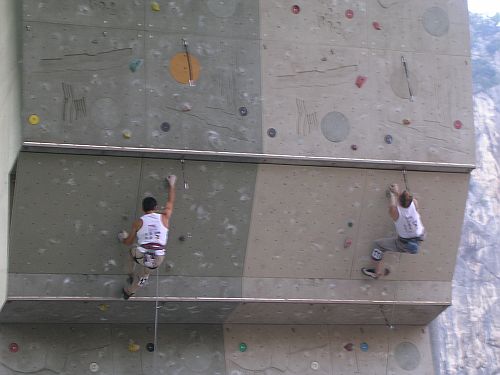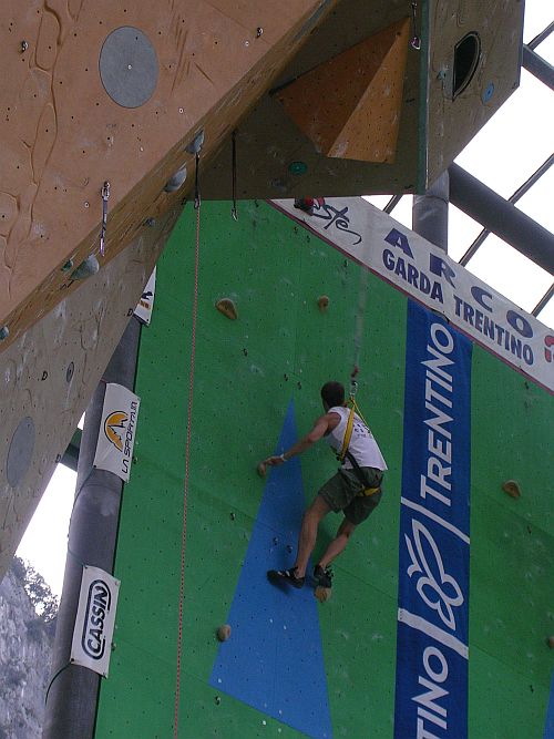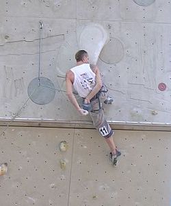 Mladičký Nepálorakušan David Lama (16 let) využívá chytře chyt v převise k odpočinku. V RP cestě dolezl David dál než Tomáš Mrázek. David byl v této cestě 3. nejlepší za 1. Ramonem a 2. Jorgem, Tomáš byl 5.