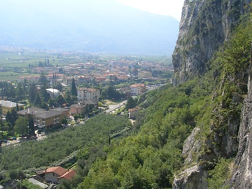 Arco den po Rock Mastru, pohled z cesty Mescalito na městečko Arco, závodní stěna je mezi stromy vlevo
