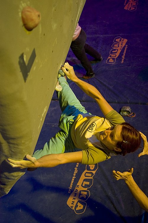 Věrka lezla před Silvou a na prvním boulderu dala na první pokus zonu a šahala po chytu, který by jí pohodově vynesl do topu. Silva dala zonu na druhý pokus a do téhož chytu šahala o něco lépe, ale chyt nedošáhla. V obou případech byla klíčem k neúspěchu založená pata místo našlápnuté špičky. Tedy 1:0 pro Věru. V druhém boulderu nesmyslně Věře smeklo a pro zonu si dolezla na druhý pokus a dva chyty pod top. Silva naopak dala zonu na první pokus a ve druhém pokusu bojovala o top. Bohužel však nenašlápla dobře malý stup a topinka se nekonala. Stav po druhém boulderu 1:1. V třetím boulderu Věrka opět šáhla po zóně na první pokus a výměna na „africe“ a následné kroucení těla, které bylo velmi nutné k dosažení dalšího chytu velmi těsně nedotáhla do konce. Silva si na zónu šáhla na druhý pokus a výměna na "africe" jí moc nesedla. Po třetím boulderu stav 2:1 pro Věrku a s Tomem by se v nás krve nedořezalo, jak jsme číhali na to, jak dopadne boj na čtyřce. Nic nebylo rozhodnuto, jak jsme už dávno chtěli :(. Naštěstí jsme byli ušetřeni toho nejhoršího a Věra se Silvou dali zonu na první pokus a do dalšího chytu se ani jedna neprobila. Velký oddech a těsné vítězství pro Věrku. Na třetí místo se postavila Saša Gendová se třemi zonami a bramborová skončila Nelly Kudrová.