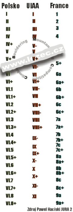 Specifická je i polská stupnice VI.1, VI.1+, VI.2, VI.2+ atd. (viz tabulka vpravo na kliknutí se zvětší v novém okně).