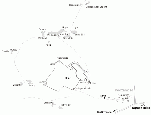 Poté, co se vymotáte z parkoviště (placené), vyrazíte přímo k hradu, u paty jeho opevnění máte dvě možnosti, ta za nejlepším lezením vede doprava stoupající stezkou podél hradeb. Minete po levé straně stojící nevysokou, ale dominantní věžičku Niedzwiedz, kde jsou spíše lehčí cesty. Po několika desítkách metrů se vnoříte do lesa a pokračujete jakoby dále od hradu dále. Až dojdete ke stěně Welká Cima. Stěnu poznáte jednoduše, vypadne vám totiž brada. Sousedí zde stěny dvě Welká Cima a Mala Cima a obě jsou naprosto parádní. Jsou to kolmé hladké zdi velikosti 4-5 patrového paneláku, na kterých je řada těžkých cest. Zpředu jsou hodně těžké cesty, náročné na prsty a špičky lezeček. Po stranách něco malinko rozumnějšího, ale ne přímo na rozlezení. Pro to je lépe celý masiv Cim obejít a na jižní straně je pěkné lehčí lezení.