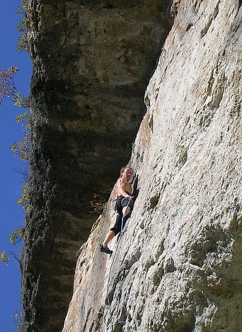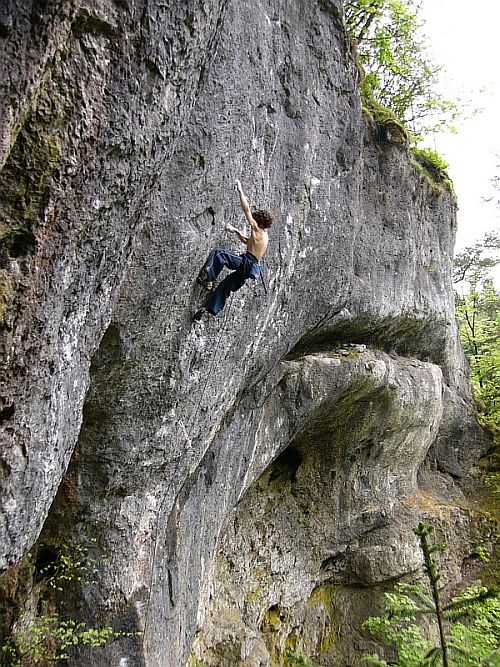 Iker Pou se rozlézá v cestě Rezession 93 (8 UIAA), Rabenstein, Frankenjura, přes údolí naproti sektoru Burn for you, před zkoušením cesty Corona 11+ (foto by Standa Holec)