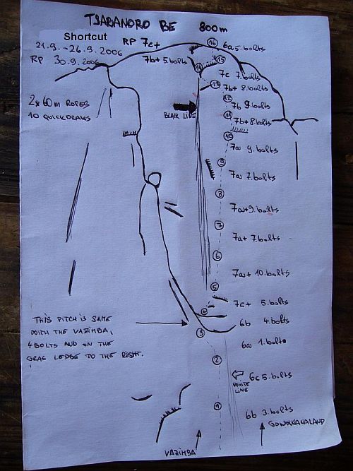 Během 5 dní vrtání, lezení a jumarování se nám podařilo všem stanout na vrcholu Tsaranoro Be 1900 m.n.m. Do 16 délek(většinou okolo 55 m) cesty jsme navrtali 140 nýtů. Obtíže délek se až na výjimky nedostanou pod 7a a klíčová délka je 7c+. Skála je z hrubozrné žuly. Zajímavostí je, že se zde leze většinou po chytech a klasické spárové žulové lezení zde nenajdete.