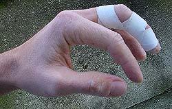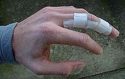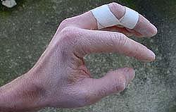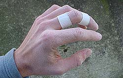 3. Vezmi 1 –1,5 cm široký kus 10 cm dlouhé pásky a omotej dokola zraněný prst mezi prvním a druhým kloubem.                                                                                            4. Vezmi 2 cm široký kus 10 cm dlouhé pásky a omotej dokola zraněný prst mezi druhým a třetím kloubem. Tajp je stejný jako při preventivním zpevnění, ale páska by měla být nepatrně více utažena.