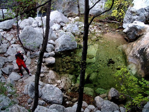 V pátek je celý den pod mrakem, ale opět lezení výborné, přelézáme zbytek jednodélkovek, odpoledne krátký relax a jdeme mrknout na hluboké průzračné tůně potoka, které v létě jistojistě nespatříte, zapadající slunce skulinou v mracích nasvětluje Anicu Kuk, od značky heliportu to divadlo pozorujeme, pomalu je čas se vrátit, večeře volá.