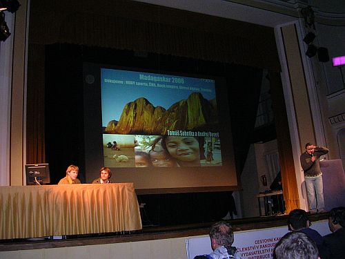 Tomáš Sobotka a Ondra Beneš vyprávějí o big wallech na Madagaskaru, vpravo moderátor Martin Zounar