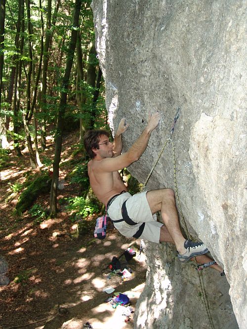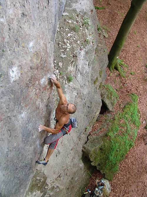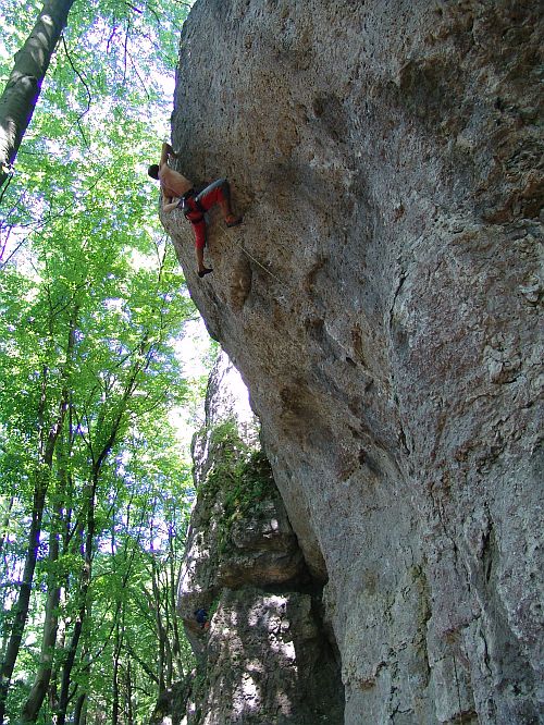 Direkter Kletterboumweg 7- dole zářez,nahoře po chytech převislou stěnou