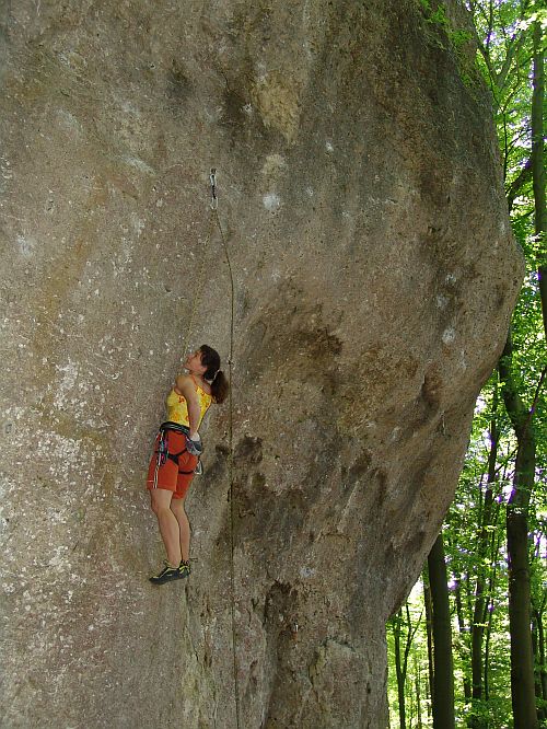 Od Mittelbergwandu nahoru a doprava do svahu. Tohle je už typická místní stěna, trochu zelená, ve stínu, chladná, ale jak to uschne, neváhejte a hurá na to.